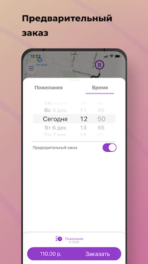 Need a car by a specific time and date? Order it in advance through the application, and at the appointed time, a taxi will be waiting for you at the entrance.