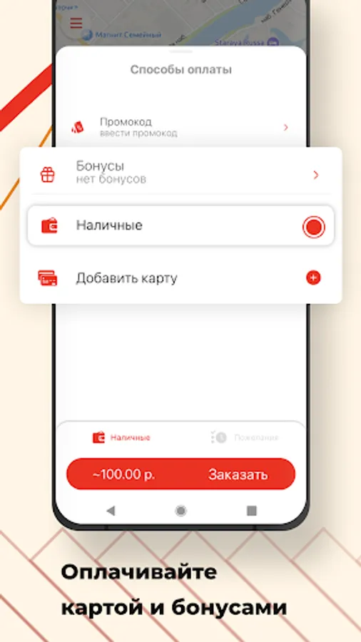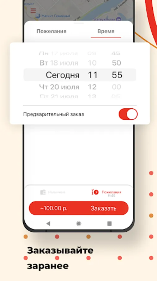 Select the "Pre-order" option. The car search will start shortly before the trip order, and the car will arrive at the appointed time. Also, you will know in advance the cost of the trip.