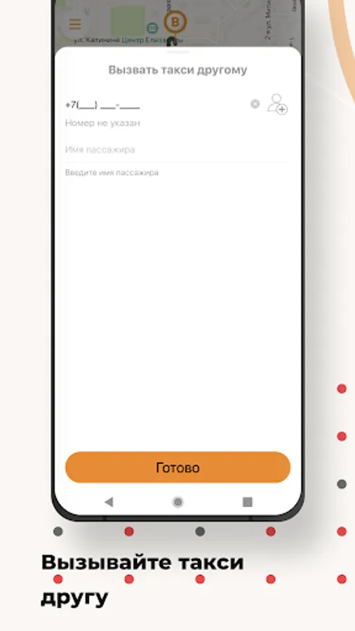 Use the option “Call a taxi for someone else” in the “Wishes” section and indicate his phone number. When the taxi arrives, an SMS will be sent to the specified number, and you will receive a message in the application.