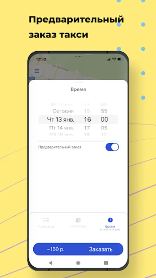 Select the "Pre-order" option. The car search will start shortly before the trip order, and the car will arrive at the appointed time. Also, you will know in advance the cost of the trip.