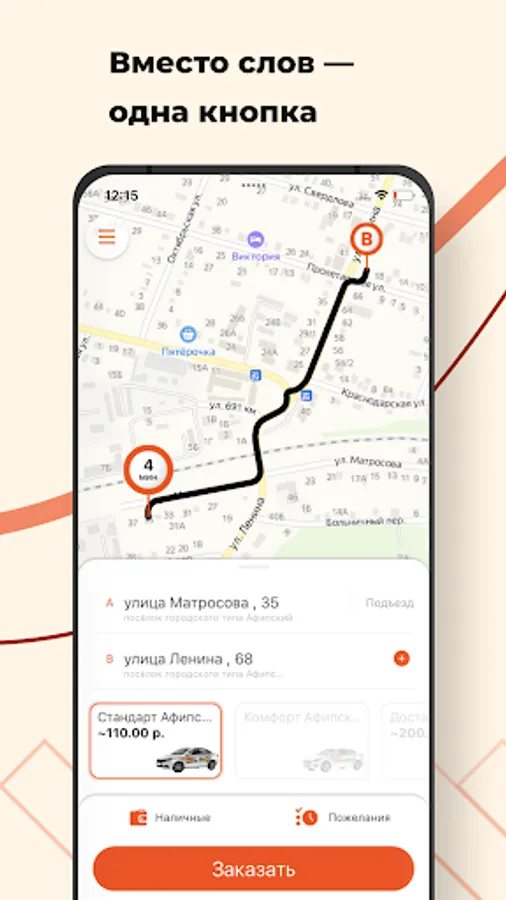 The delivery address will be determined automatically. You just need to indicate where you are going. Use templates with addresses and settings that you use most often to order a taxi in a couple of clicks.