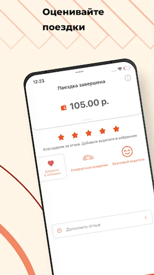 Rate the driver, write a review, or select a reaction from ready-made templates. View payment details after the trip.