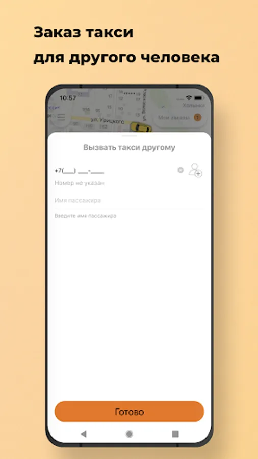 Use the option “Call a taxi for someone else” in the “Wishes” section and indicate his phone number. When the taxi arrives, an SMS will be sent to the specified number, and you will receive a message in the application.