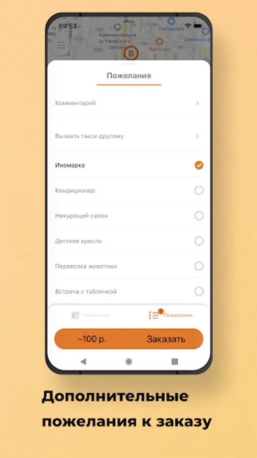 Please add additional requests to your order. For example, when it's +35 outside - select "air conditioning". If you cannot stand the smell of tobacco, select "Non-smoking salon", and a non-smoking driver will come to you.