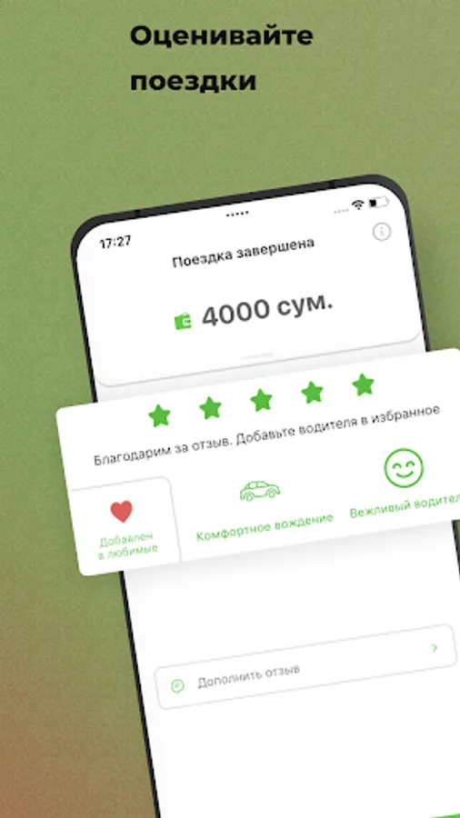 Rate the driver, write a review, or select a reaction from ready-made templates. Add the driver to your favorites if you liked the trip.