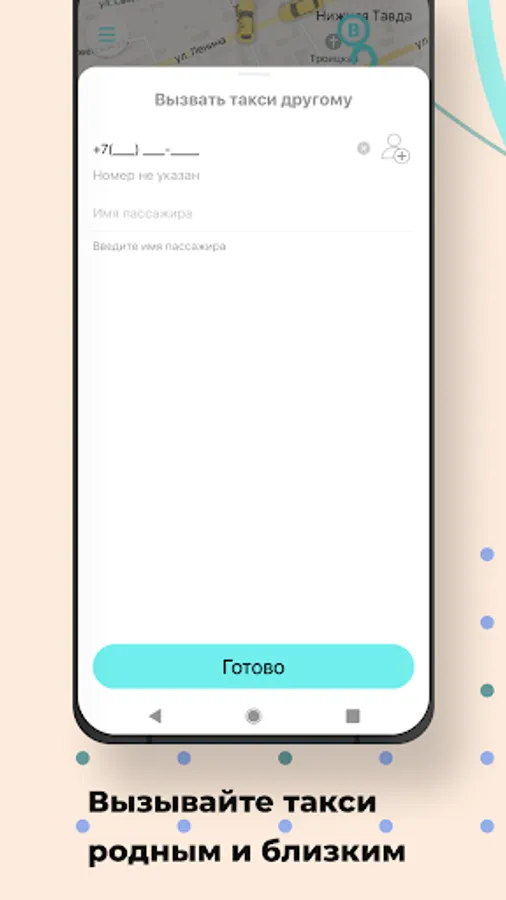 Use the option “Call a taxi for someone else” in the “Wishes” section and indicate his phone number. When the taxi arrives, an SMS will be sent to the specified number, and you will receive a message in the application.