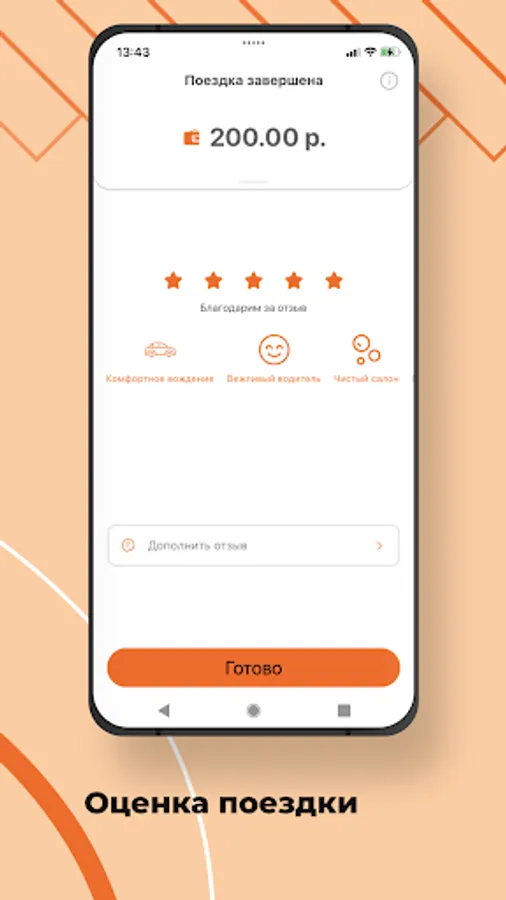 Rate your trip with ready-made templates. Add the driver to your favorites if you liked the trip, or thank him with a tip.