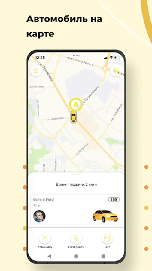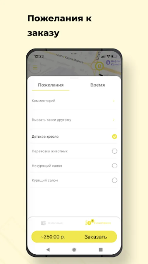 Use the option “Call a taxi for someone else” in the “Wishes” section and indicate his phone number. When the taxi arrives, an SMS will be sent to the specified number, and you will receive a message in the application.