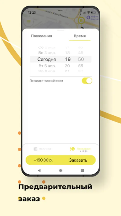 Select the "Pre-order" option. The car search will start shortly before the trip order, and the car will arrive at the appointed time. Also, you will know in advance the cost of the trip.