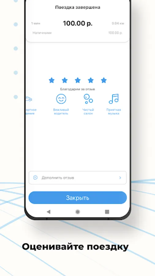 Rate your trip with ready-made templates. Add the driver to your favorites if you liked the trip, or thank him with a tip.