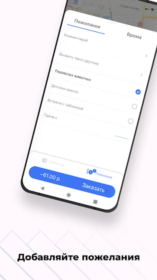 Use the option “Call a taxi for someone else” in the “Wishes” section and indicate his phone number. When the taxi arrives, an SMS will be sent to the specified number, and you will receive a message in the application.