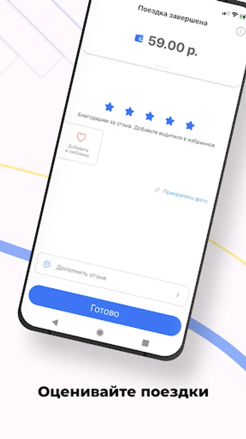 Rate the driver, write a review, or select a reaction from ready-made templates. Attach a photo to a review, leave a tip, or view payment details after your trip.