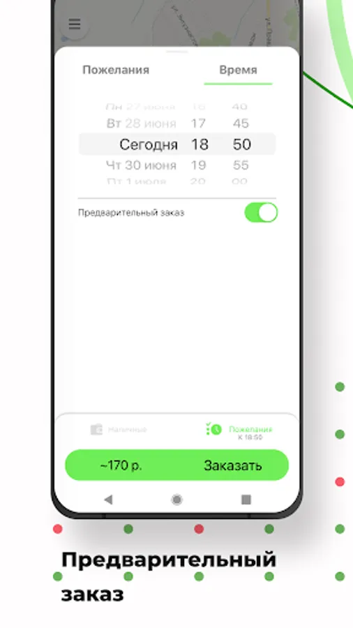 Need a car by a specific time and date? Order it in advance through the application, and at the appointed time, a taxi will be waiting for you at the entrance.