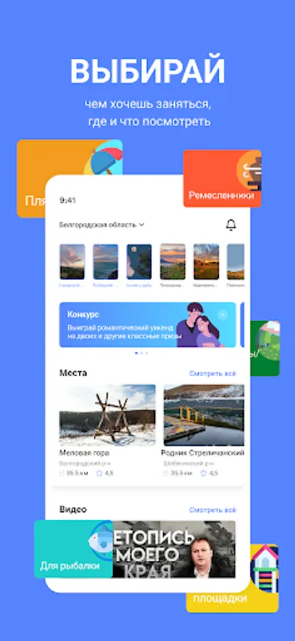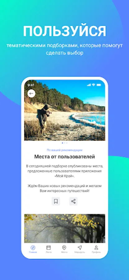 Our application will provide you with special thematic collections that correspond to a wide variety of interests. Here you will find the best places for romantic walks around the city, fun trips with a company out of town, locations for spectacular photo shoots, places for secluded recreation and fishing, beautiful landscapes and much more.