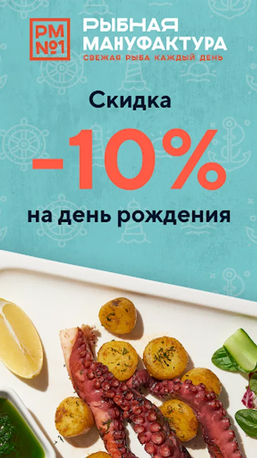 Take a look at your personal account - your bonus card as a member of our "Fish Club" has appeared in it. You are already accumulating points with every purchase. Now bonuses can be spent not only in our store or bistro, but also with a new order in the application, as well as on our website rm-1.ru