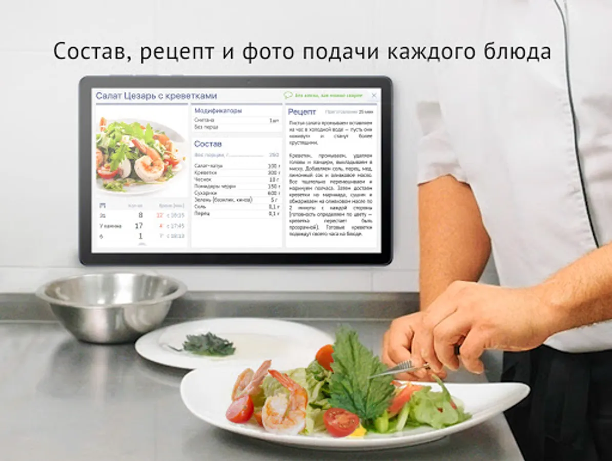 The waiter adds the dish to the order, and the cook immediately sees it on the screen. The cooking time, sequence, comments are immediately looked at. If necessary, opens a recipe on the screen, a serving photo and starts cooking.