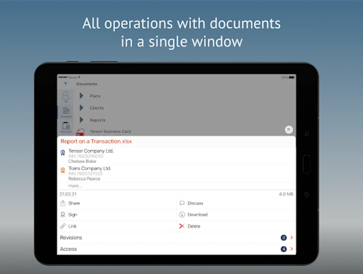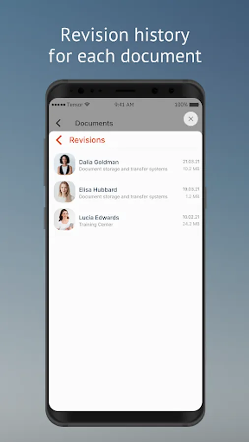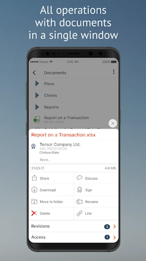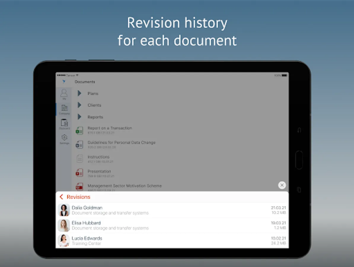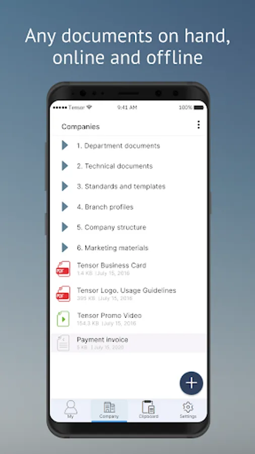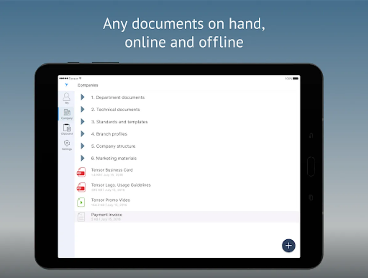 You can view corporate documents and work with them from anywhere. Even if you uploaded them to the storage from the PC, you will be able to find them in your mobile device.