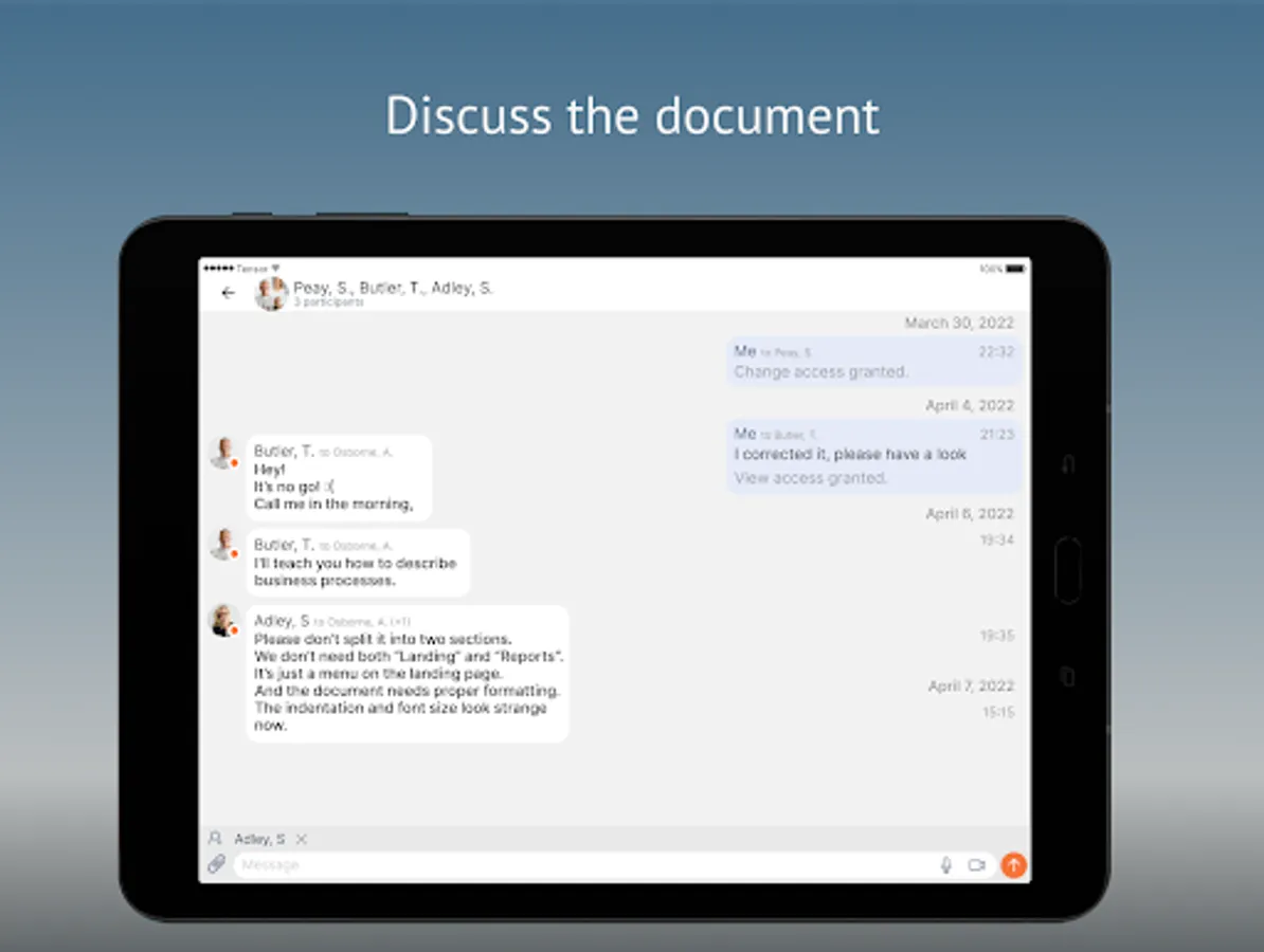 Upload documents from any sources: smartphone camera, email attachments, conversations, and so on. You can share documents with a colleague or entire departments.