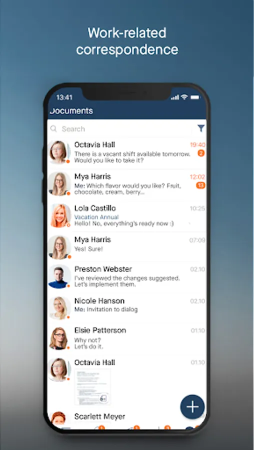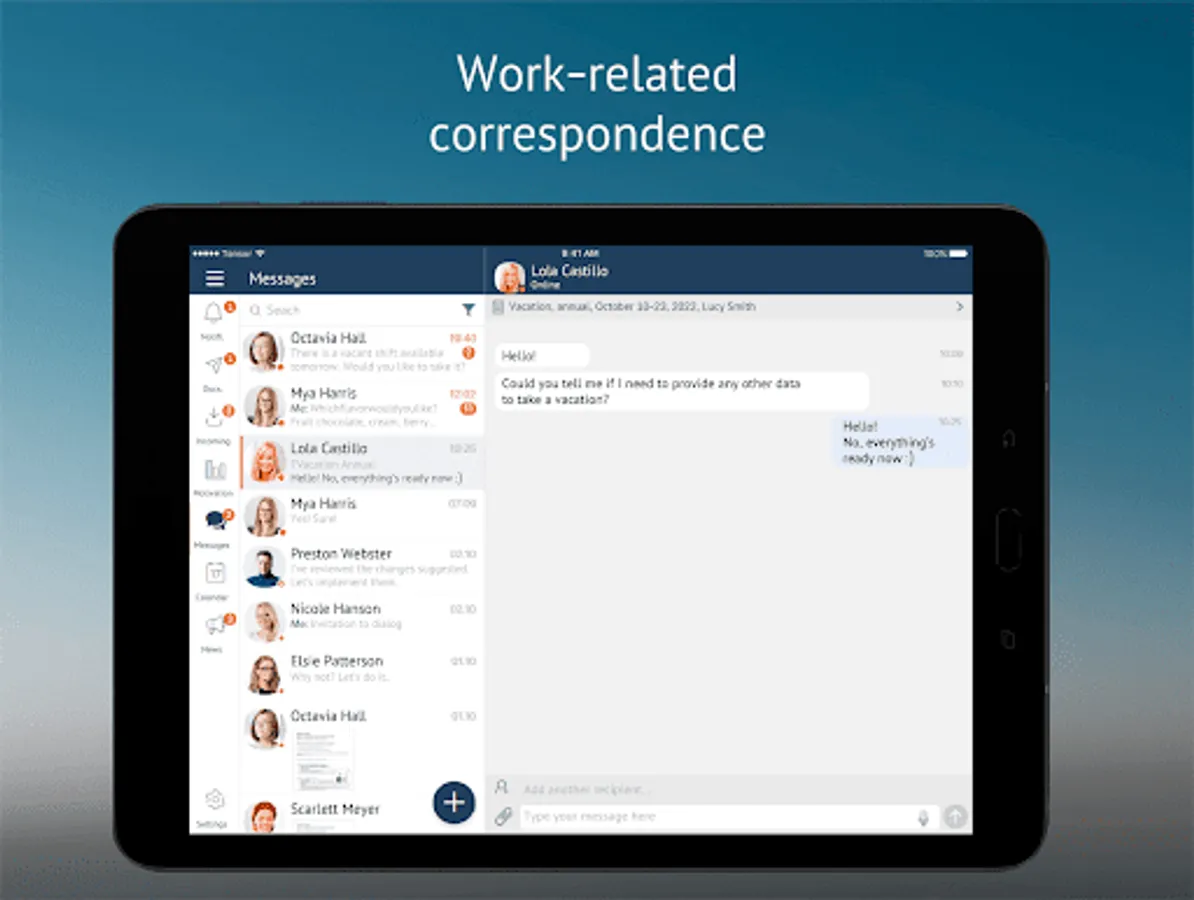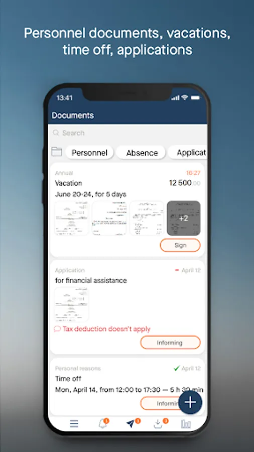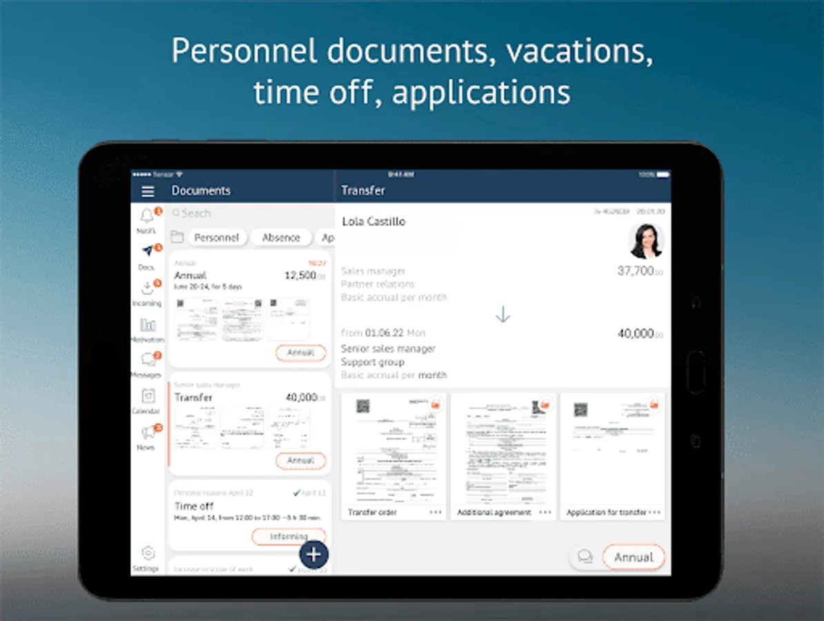 • Personnel documents connected with hiring, transfers, vacations, and time off, including applications and requests—create and sign them right in the app.