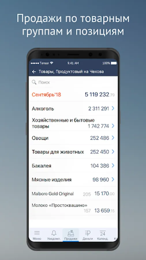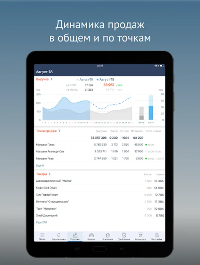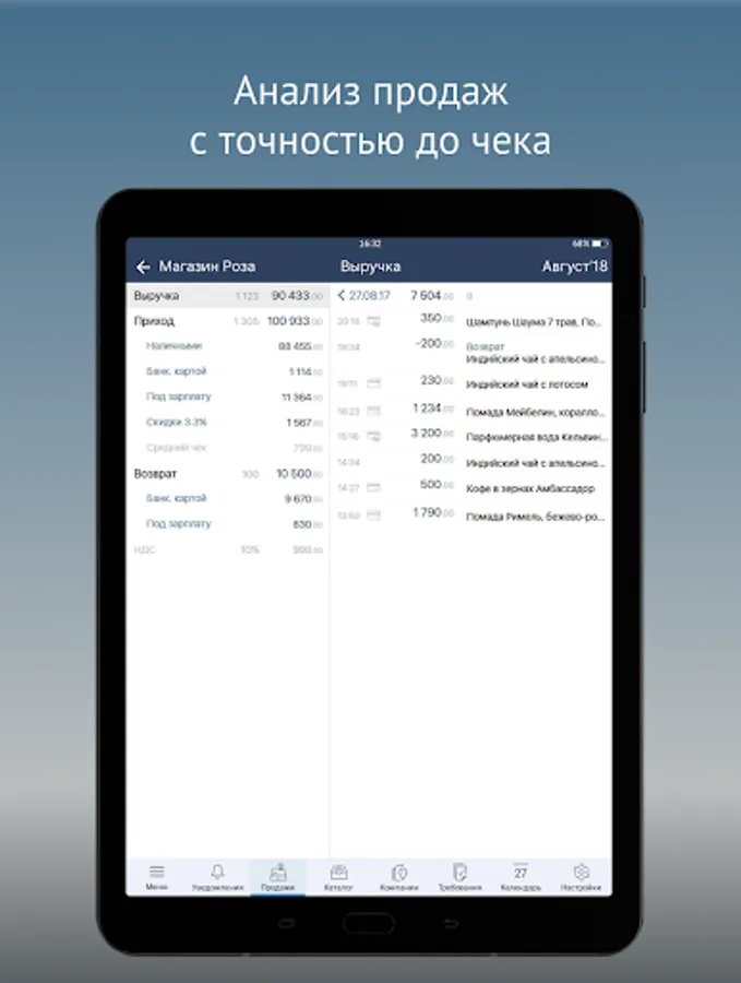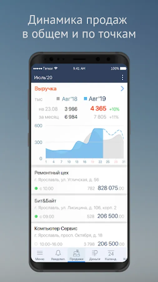 • Dynamics of sales - the amount of revenue, quantity and average check, comparison by periods.