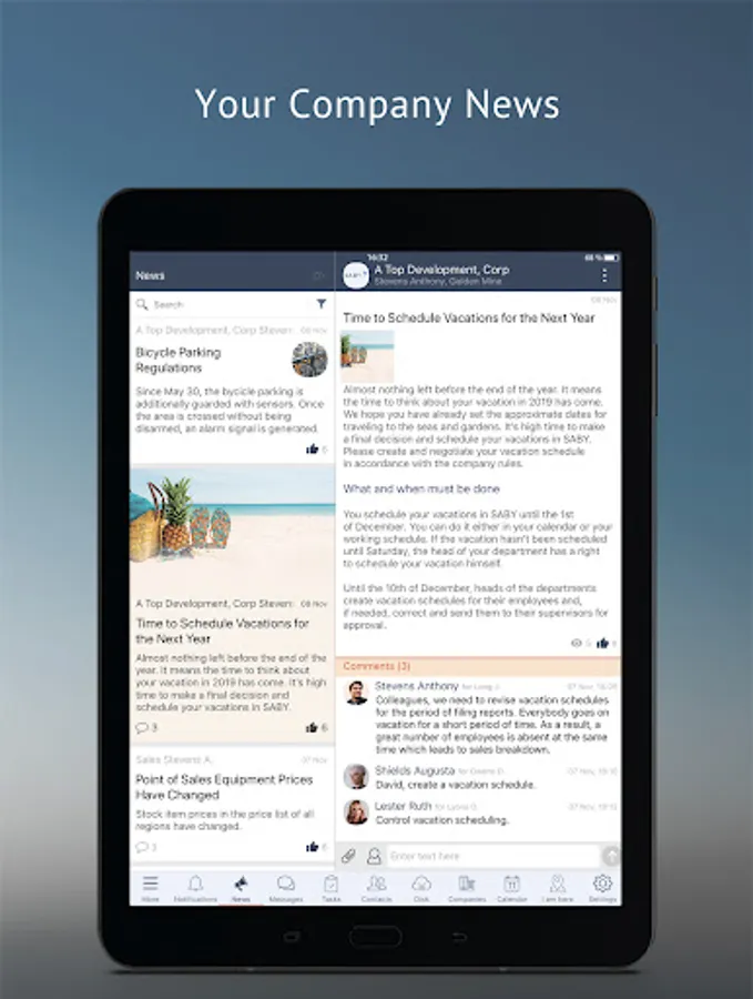 • Work Calendar – yours and your colleagues’, processing vacations, times off, sick leaves and business trips.