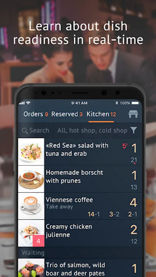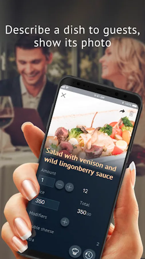 The waiter sees a detailed description and photos of all the dishes, which means that they will quickly and accurately advise the guests. When the order is typed, the waiter sends it to the kitchen, if necessary, settings dishes serving order — what to cook immediately and what later. The dishes are ready — the waiter receives a notification and immediately picks them up in the kitchen. For paying, the waiter prints the bill remotely on the printer.
