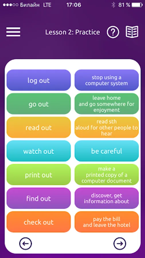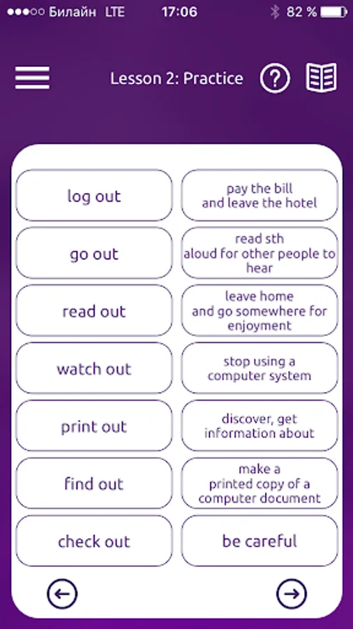 * Phrasal verbs organized into lessons