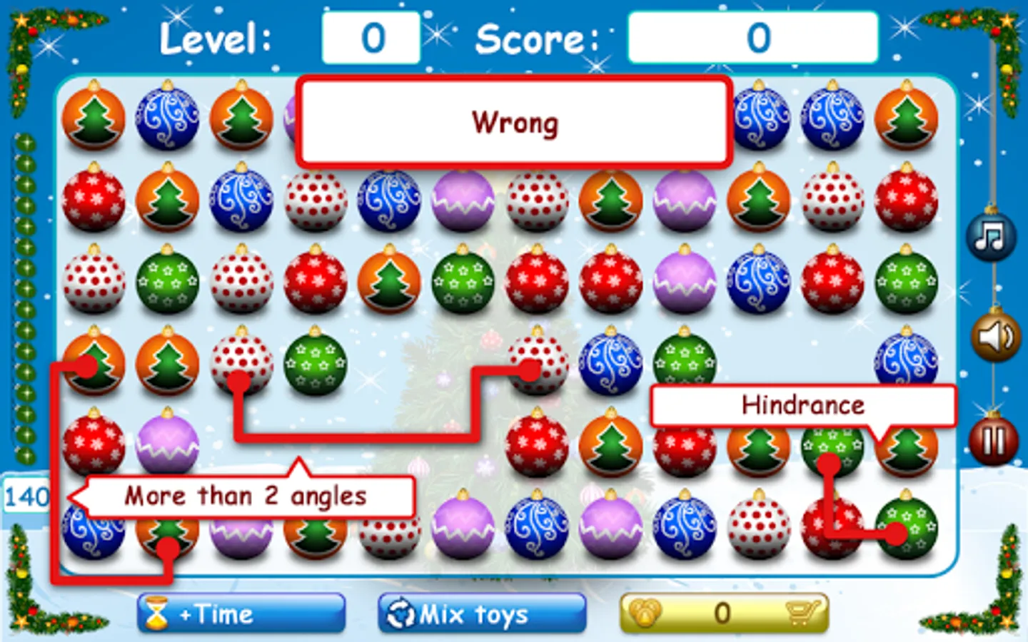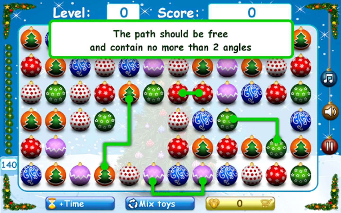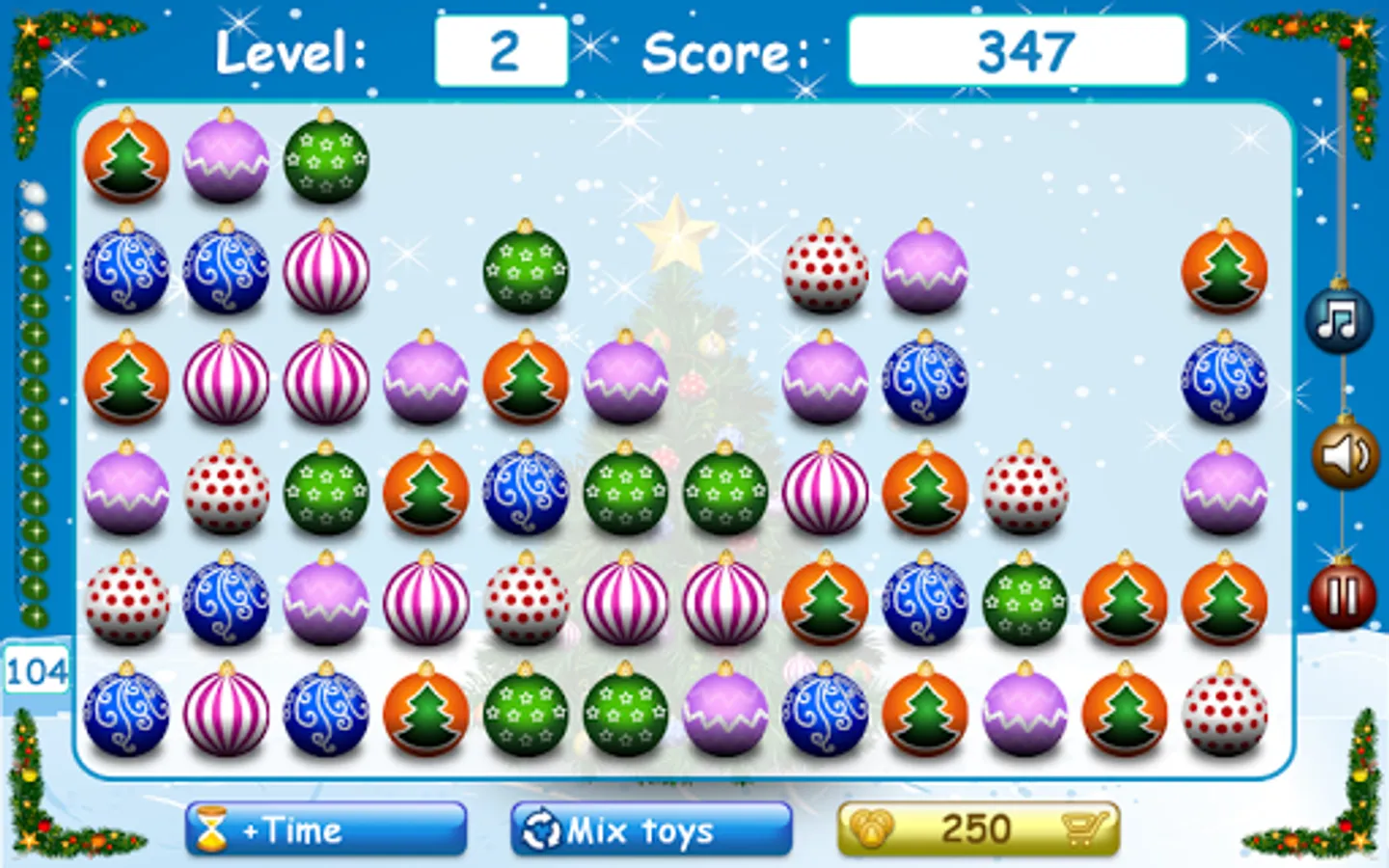 Every next level is complicated by the change in the playing field after each move (Christmas tree balls are poured down, up, into the center, etc).