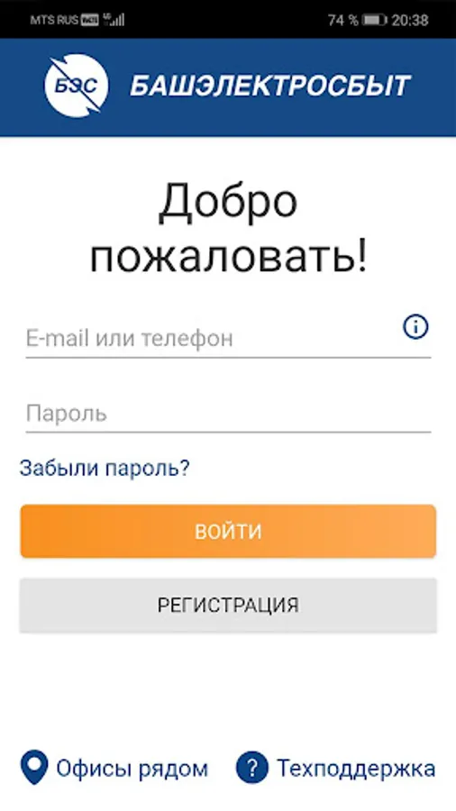 If you are registered in your Personal Account on the Bashelectrosbyt website, to enter the application you just need to use the phone number or e-mail and password you specified during registration.