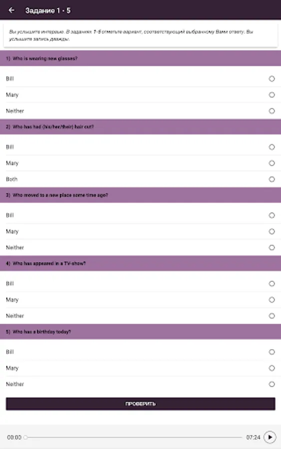Training tests All-Russian verification work (CDF-2019) in English for 11th grade. The author of the tests is KP Slovokhotov. The application includes 5 tests containing the tasks of all parts of the CDF. Each test contains QPR tasks on listening, reading, grammar and vocabulary, as well as tasks on the oral section of the CDF. All tests on the format and level of complexity correspond to the CDF for class 11 and the CDM-2019 demo version, published by the FIPI. Audio recorded by the British. The application itself checks your answers on listening, reading, vocabulary and grammar and shows which ones are correct and which ones are incorrect. You can also record and send your answers to all the tasks of speaking to a teacher or tutor via e-mail and through any instant messenger installed on your device. Tasks can be performed again and again as needed to obtain completely correct answers. Such training will help you prepare to successfully solve the tasks of the CDF in the English language.