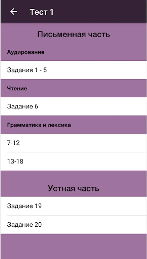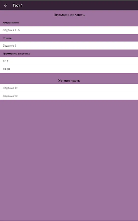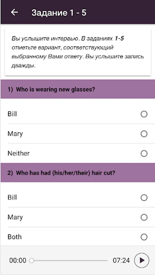 Training tests All-Russian verification work (CDF-2019) in English for 11th grade. The author of the tests is KP Slovokhotov. The application includes 5 tests containing the tasks of all parts of the CDF. Each test contains QPR tasks on listening, reading, grammar and vocabulary, as well as tasks on the oral section of the CDF. All tests on the format and level of complexity correspond to the CDF for class 11 and the CDM-2019 demo version, published by the FIPI. Audio recorded by the British. The application itself checks your answers on listening, reading, vocabulary and grammar and shows which ones are correct and which ones are incorrect. You can also record and send your answers to all the tasks of speaking to a teacher or tutor via e-mail and through any instant messenger installed on your device. Tasks can be performed again and again as needed to obtain completely correct answers. Such training will help you prepare to successfully solve the tasks of the CDF in the English language.