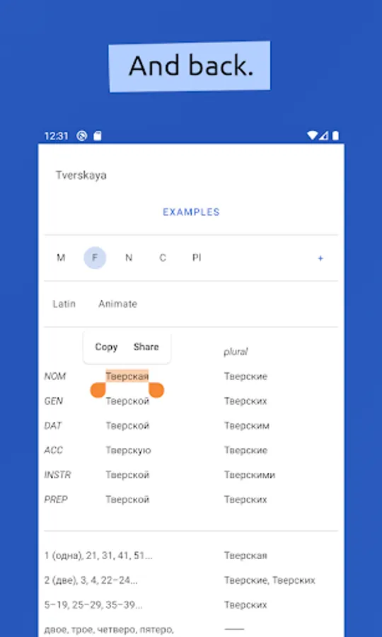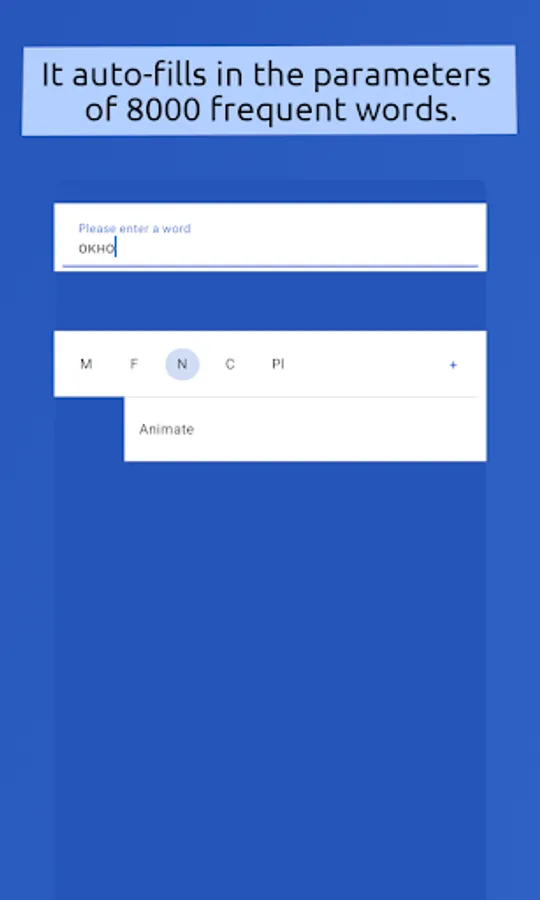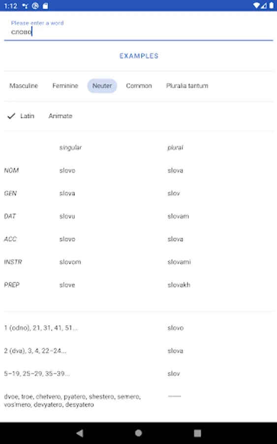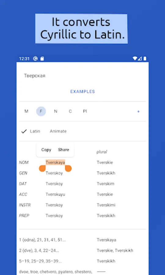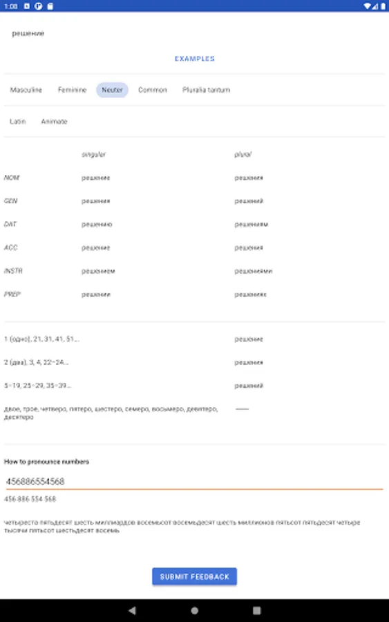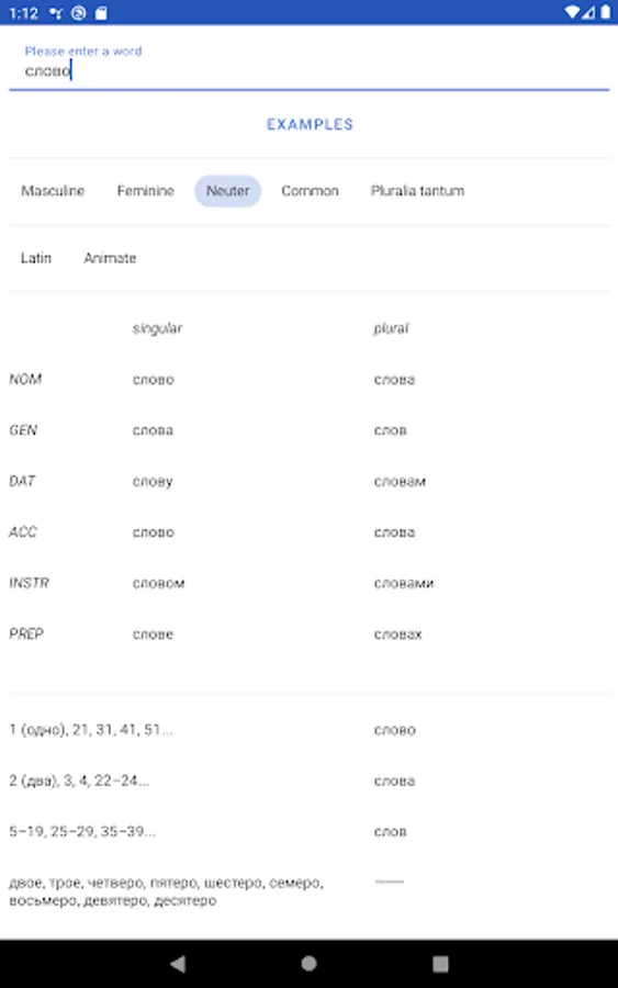 Grammar is not mathematics: it is better to feel it, not understand it. This app will help you to feel the patterns of Russian cases. It is tested for 90,000 words and processes even arbitrary letter sequences.