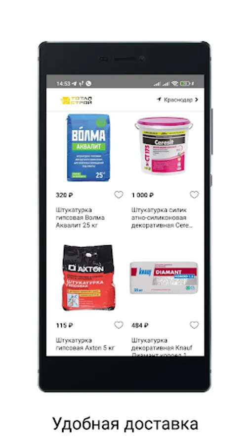 We are glad to welcome you to the official Total Stroy app. Our company is engaged in the sale and free delivery of finishing and building materials in Krasnodar: