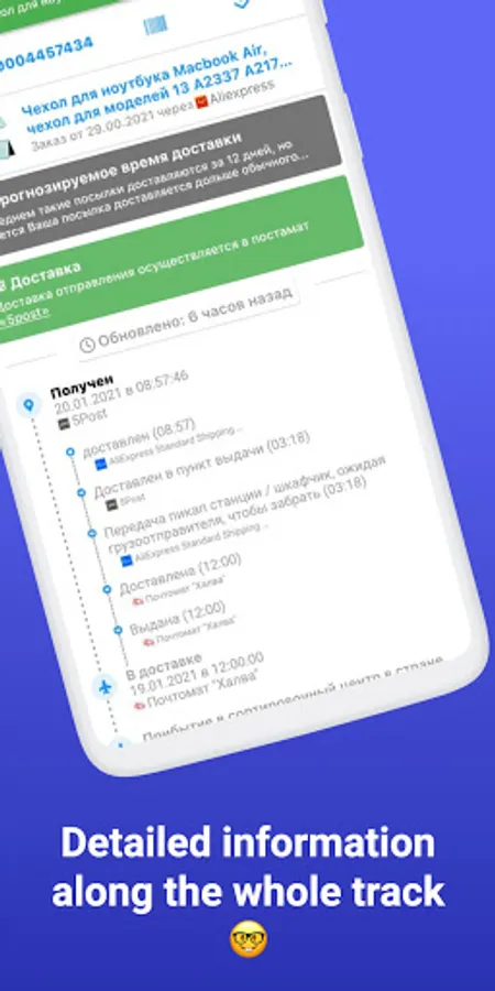 Track all your parcels with Aliexpress (aliexpress), Joom (Jum), JD, Pandao, Amazon parcel tracker, GearBest and other online stores, without ads, registrations and SMS, for that with Push notifications about the status of the parcel, Russian mail tracking.