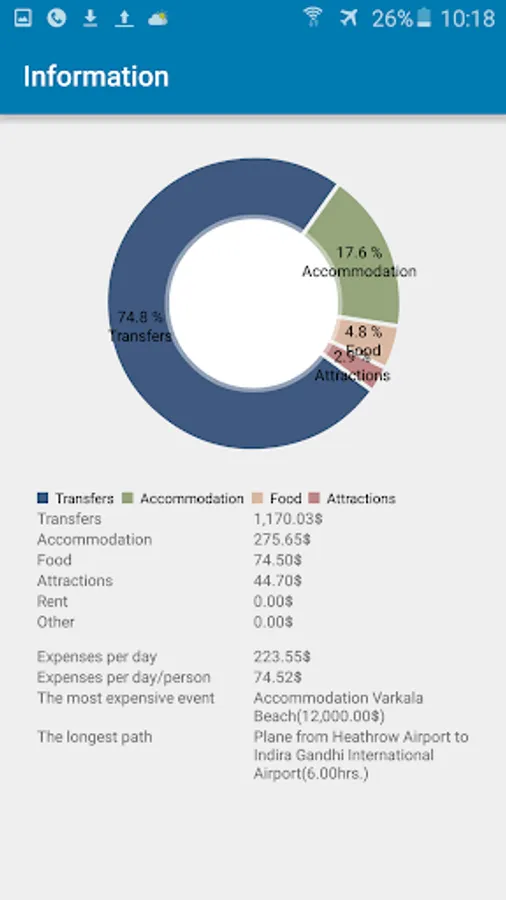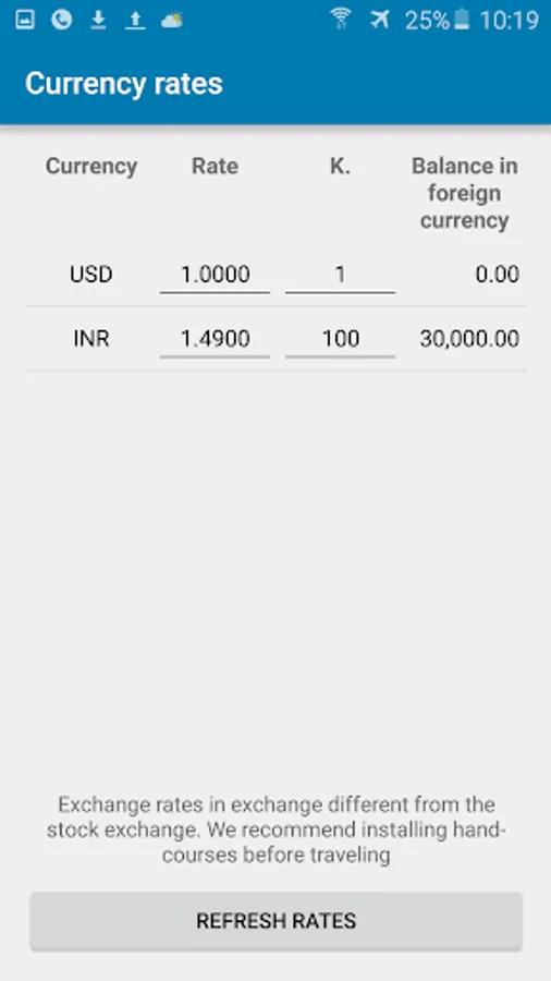 • Keep track of spending plans and traveling in all currencies of the world (for full version): Collect the summary balances required currency, update courses, if there is the Internet, allowing the user to set their courses manually for each travel