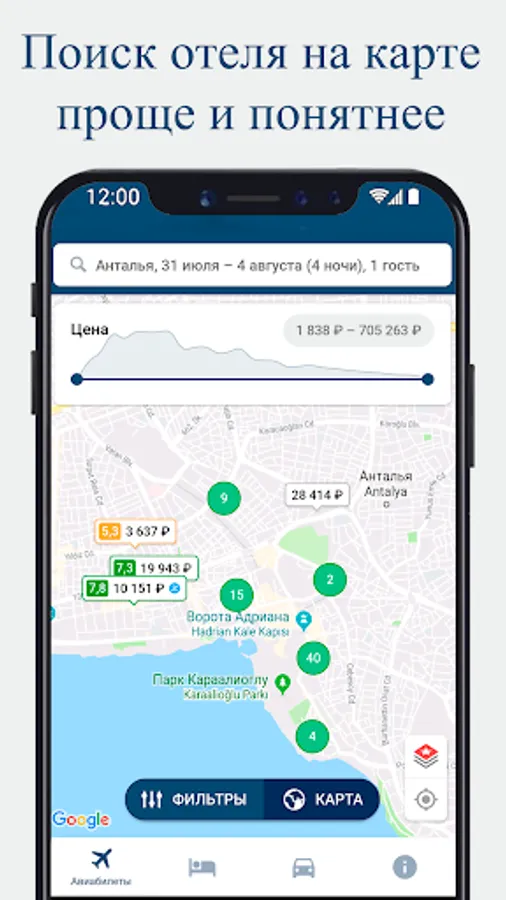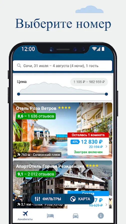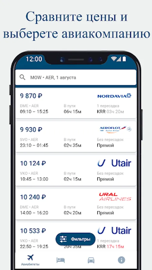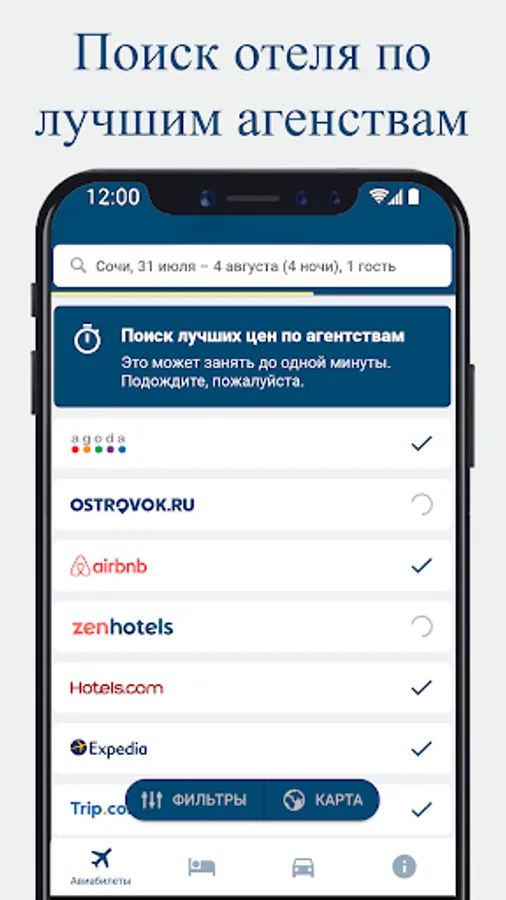 The journey does not end with a flight to a country or city. For accommodation, look for hotels in the application at the same time on, HOTELS.COM, EXPEDIA, OSTROVOK, TRAVEL.RU, HOTELLOOK and in 80 more online booking systems!
