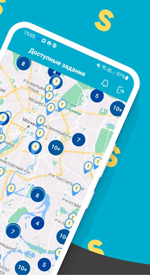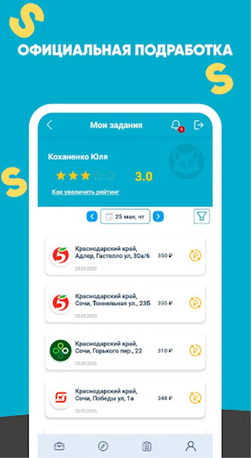 Using a mobile application, you can find work in most regions of Russia, popular cities: Moscow and Moscow Region, Krasnodar, Sochi, St. Petersburg, Kazan, Yekaterinburg, Tyumen, Murmansk, Novosibirsk.