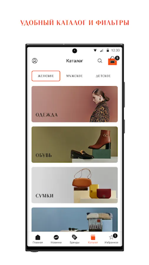 The virtual showcases of our application feature women's, men's and children's clothing. Dresses, trousers, shoes, bags, perfumes and cosmetics. With just a few clicks, you can shop online and purchase designer items or accessories from the collections of fashion masters from all over the world: