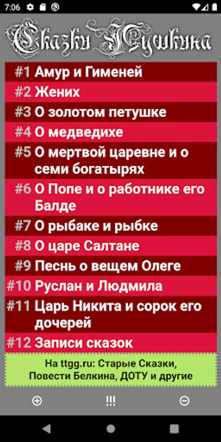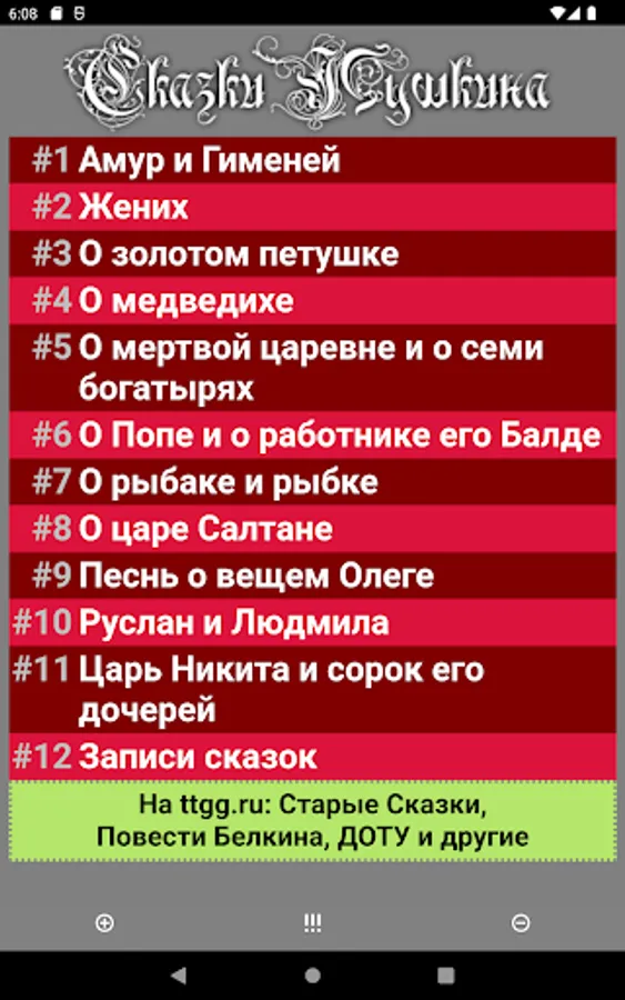 All beloved tales of A. S. Pushkin for children and adults with convenient controls.