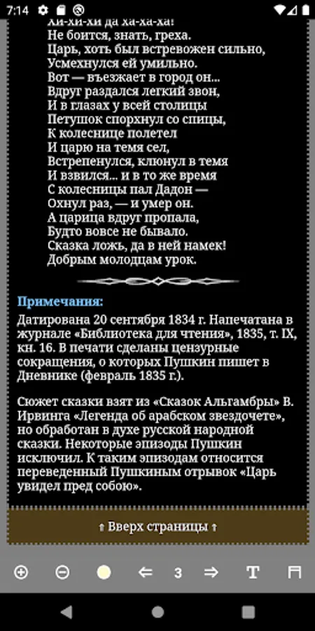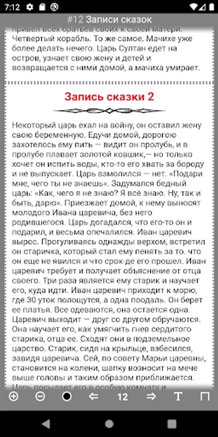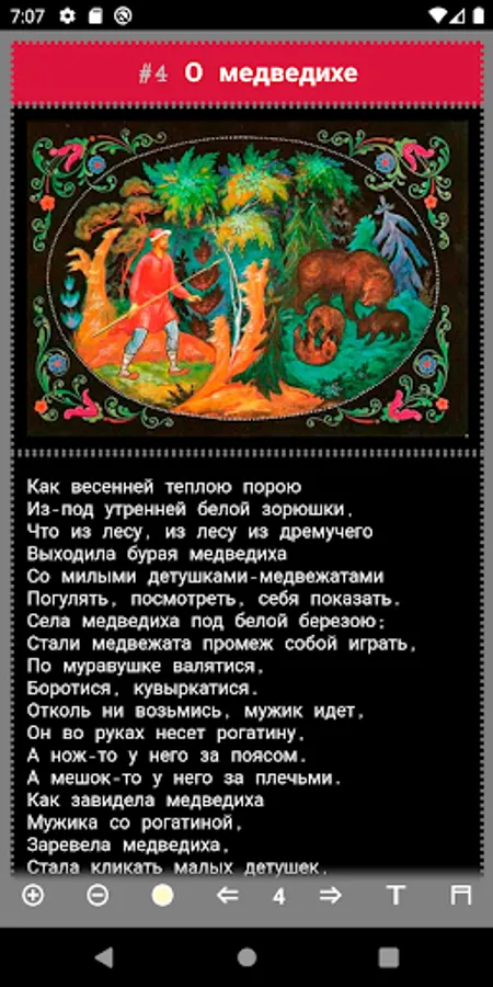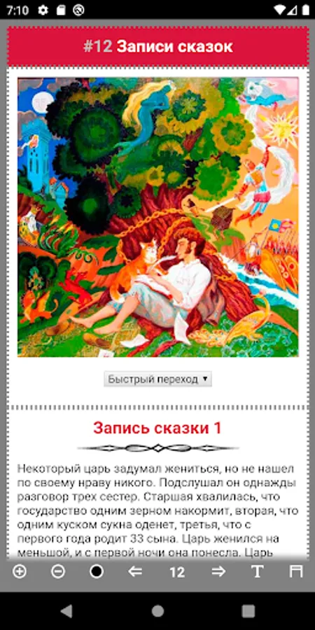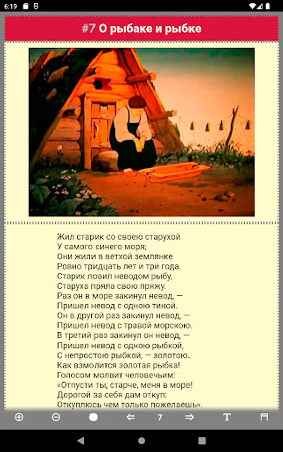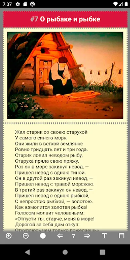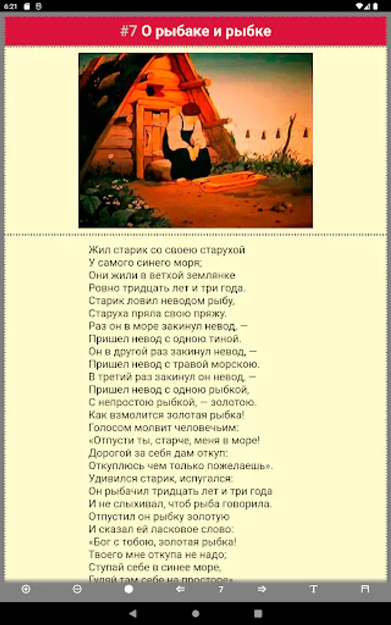 The application has convenient controls and menus. It is possible to choose a background: white, black and yellow, change the font size, type of font, and also turn over fairy tales. You can enable the output of the strip with the name of the tale at the top. In addition, the last place you read when you close the application is remembered. You can open the application and continue reading.
