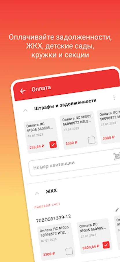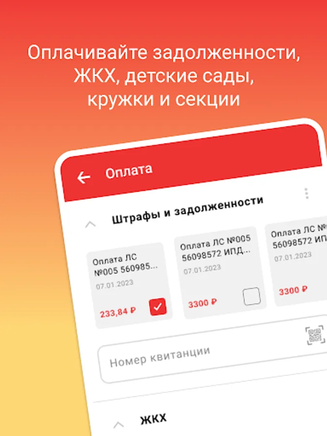 Pay fines and add personal accounts of housing and communal services and educational institutions for payment without paper receipts