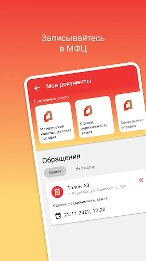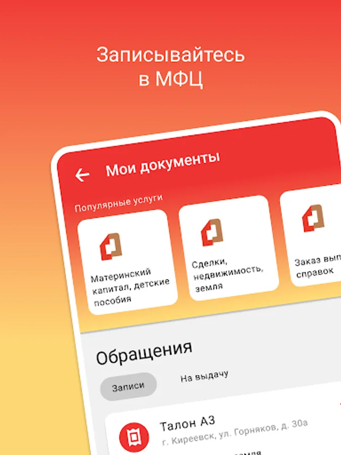 Make an appointment at the MFC, choose a branch and time of visit based on workload statistics, track the status of the application