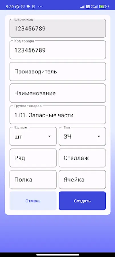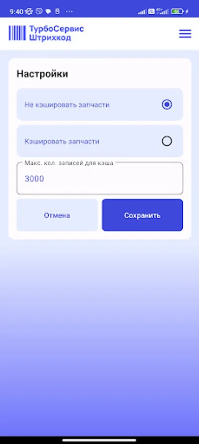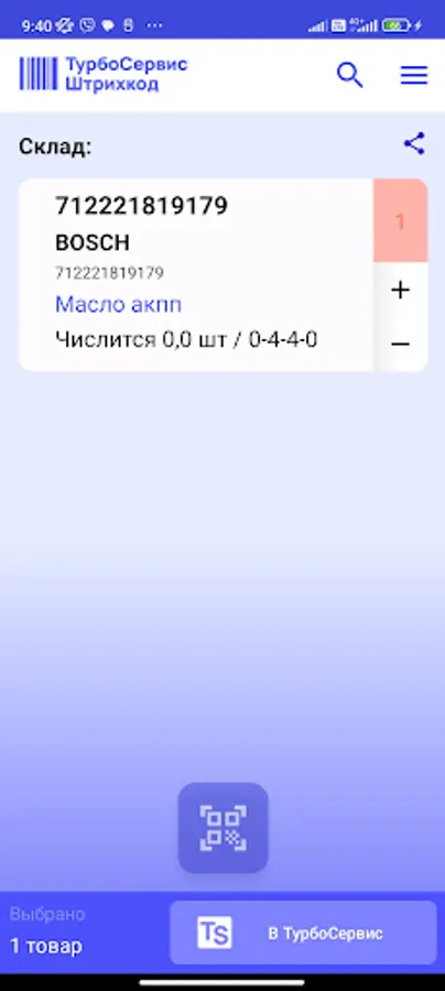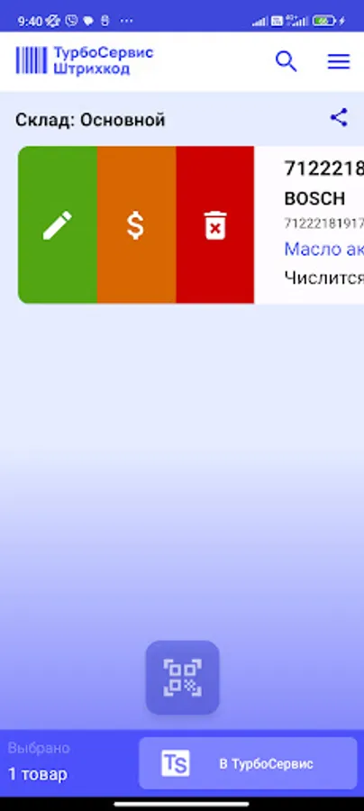 The application is intended for use with the "TurboService" program. It allows you to quickly take inventory, add items to your shopping cart for quick sale or delivery, and estimate the current market value of parts.