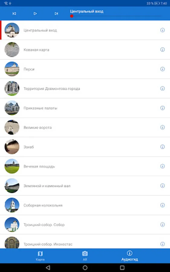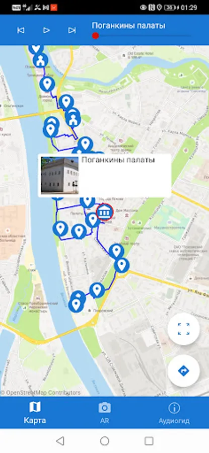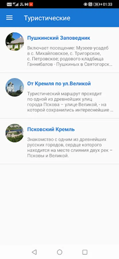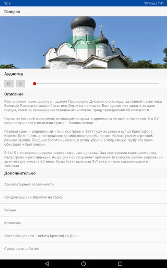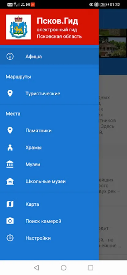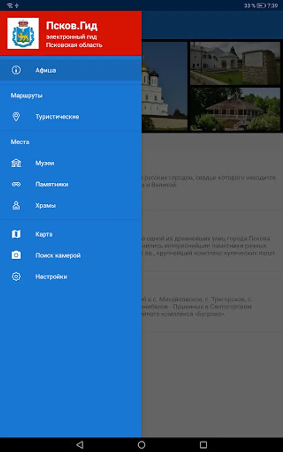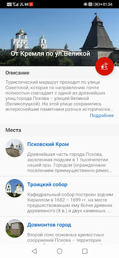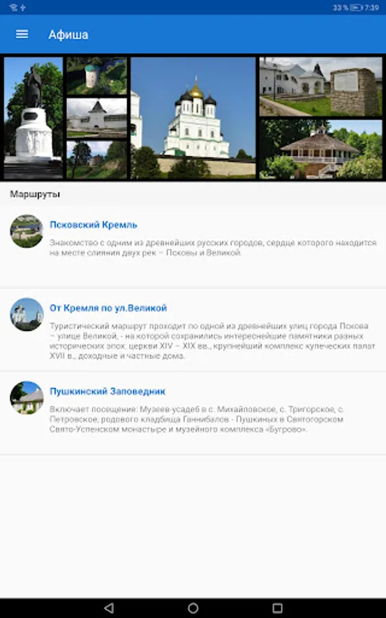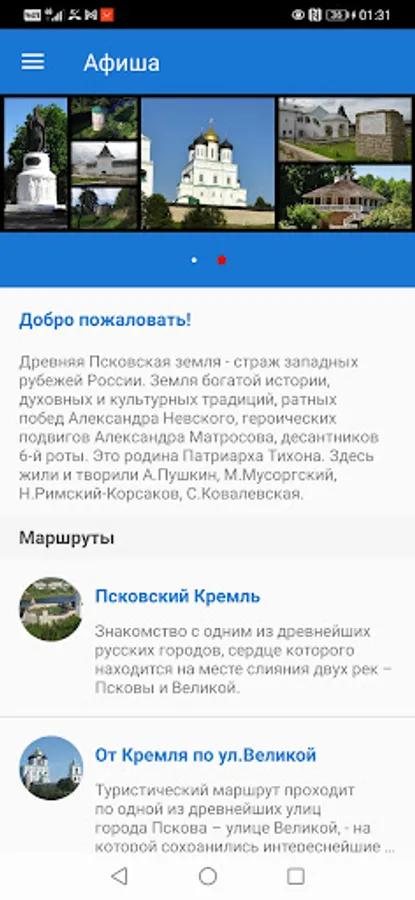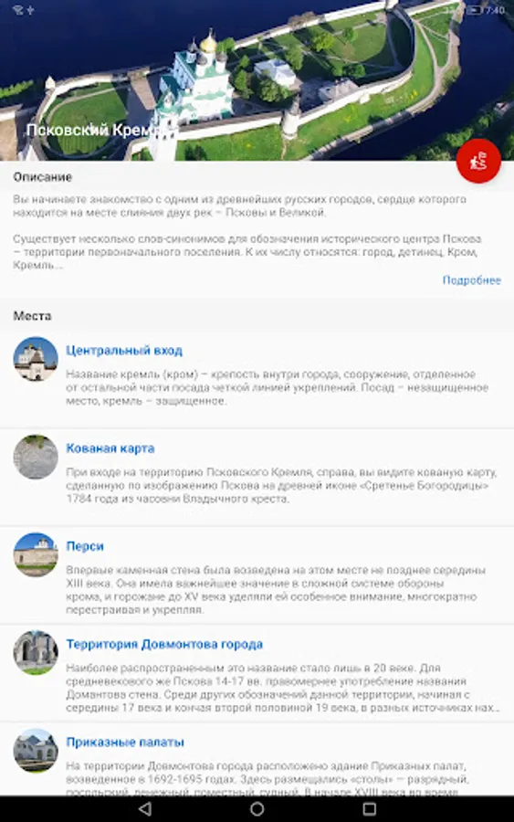 The application will introduce you to the history of Pskov and the Pskov region. With an electronic guide, you can visit all the most interesting places combined into tourist routes. You can learn interesting facts, legends and stories about temples, monuments and other places of interest. All basic information about tourist sites is available in the form of an audio guide.