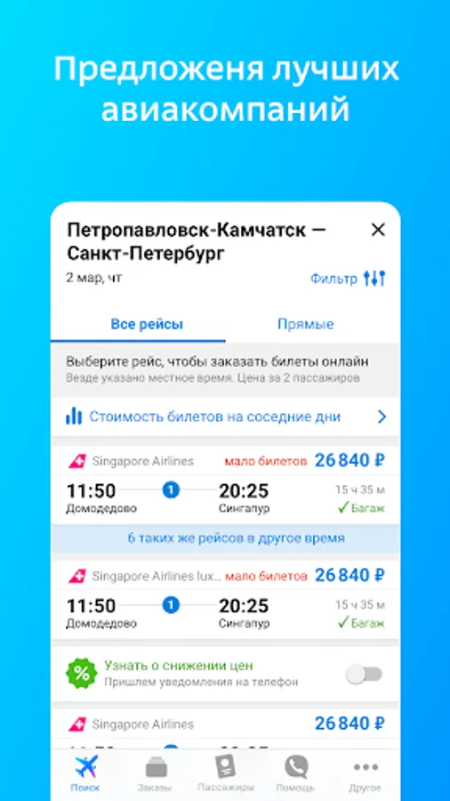 Buying air tickets cheaply and in just a few minutes to anywhere in the world is a reality. The cheapest plane tickets from Aeroflot, Pobeda, S7 (s7, Siberia), Yamal, Ural Airlines, Utair (UTair), Air Baltic, low-cost airlines Air Berlin, Lufthansa, Air France, Emirates, British Airways and many others in one application .