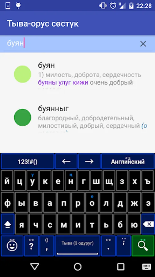 To successfully use the dictionary, we recommend tyvan keyboard layout "Tyva tanal" - it will let you to type tyvan letters "ӨҢҮ" from extended cyrillic.
