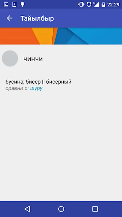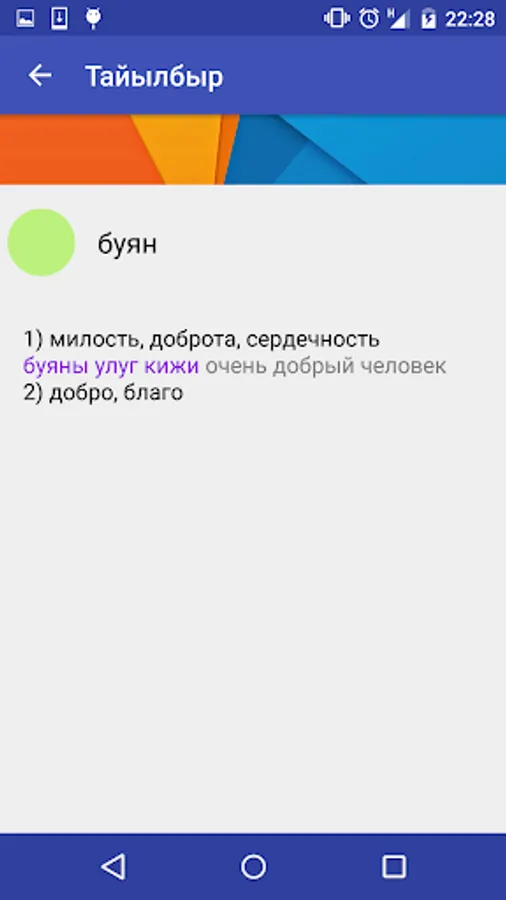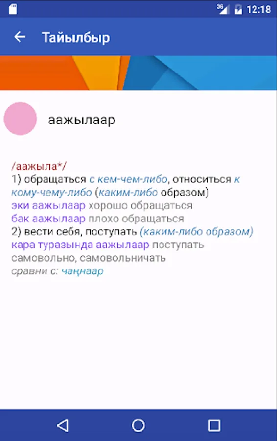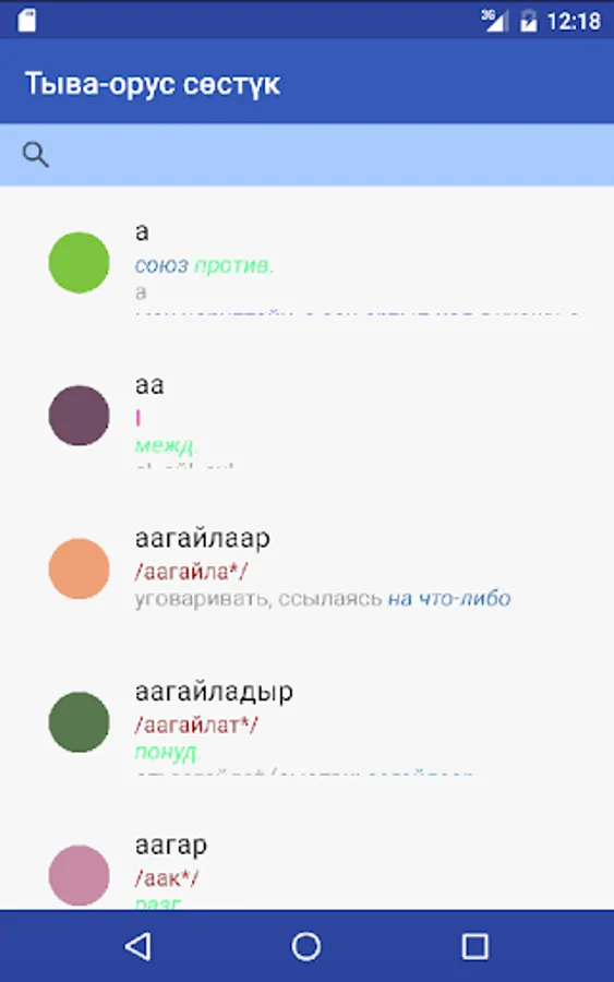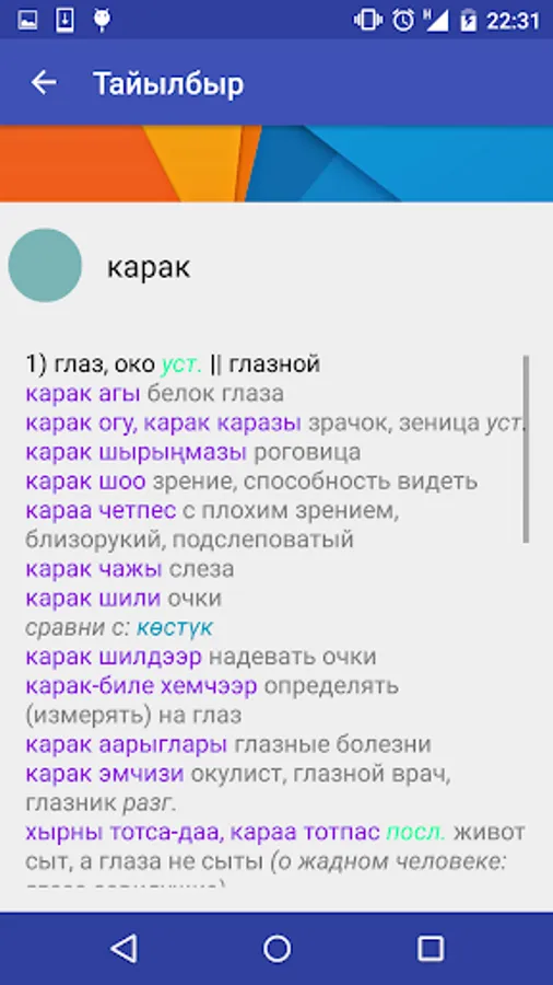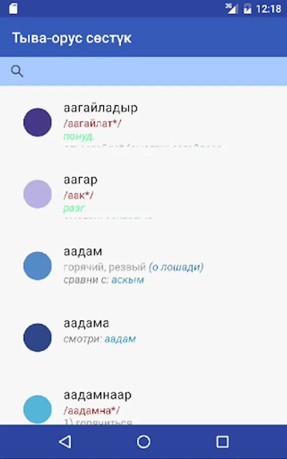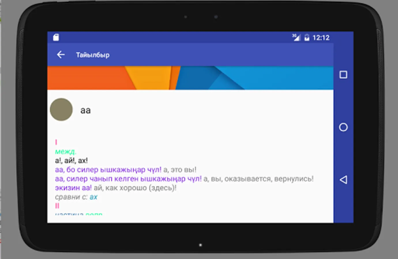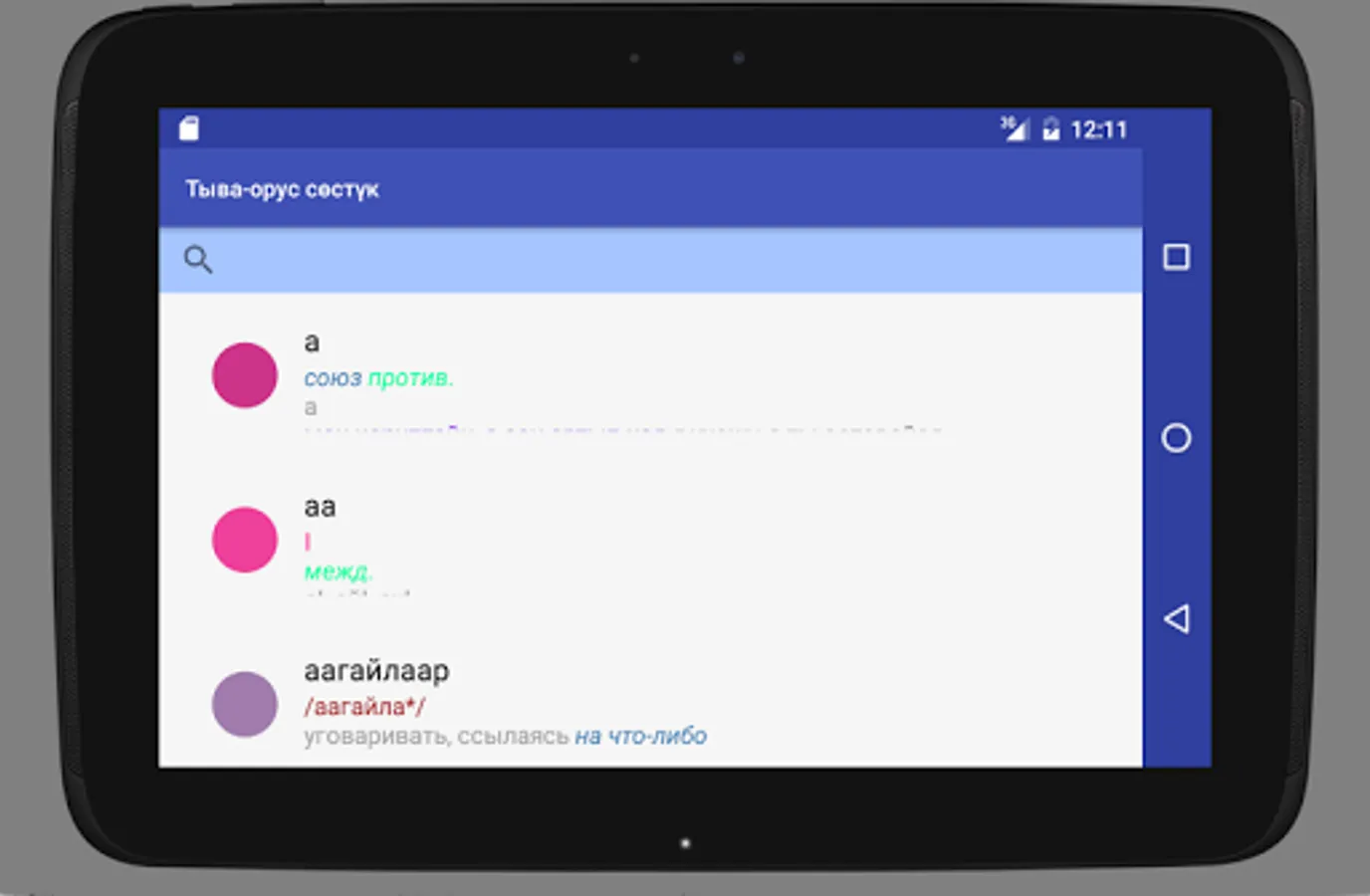 The first application of the Tyvan-Russian dictionary made up from a unique database. The dictionary is decorated with colored and stylized highlight text.