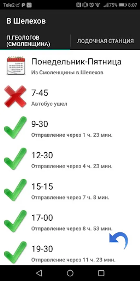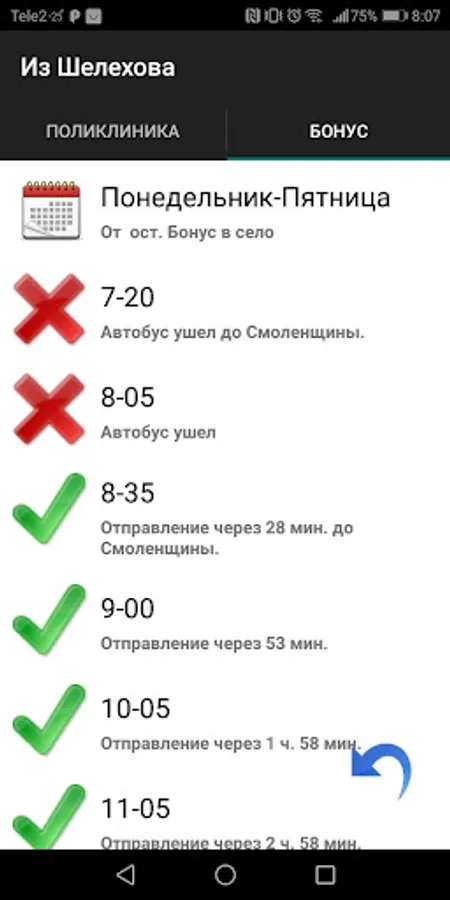 Timetable for stops Boat station, School, Clinic, Bus station, Bonus.