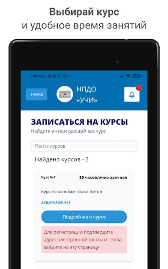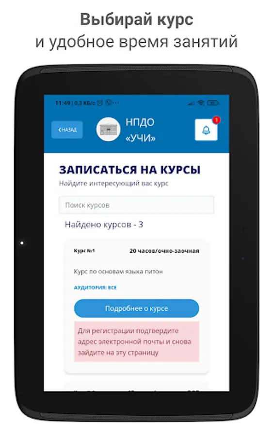 The educational platform allows you to choose courses for advanced training and postgraduate education, as well as learn about current seminars, conferences in the educational field
