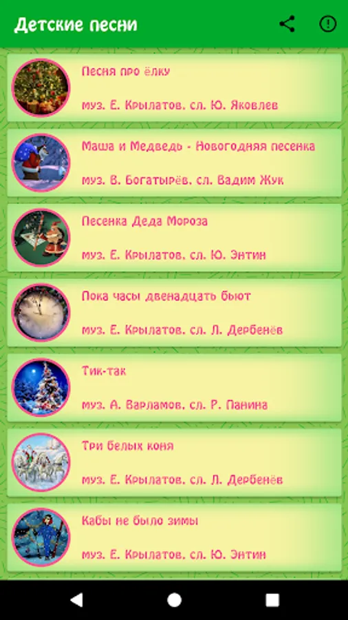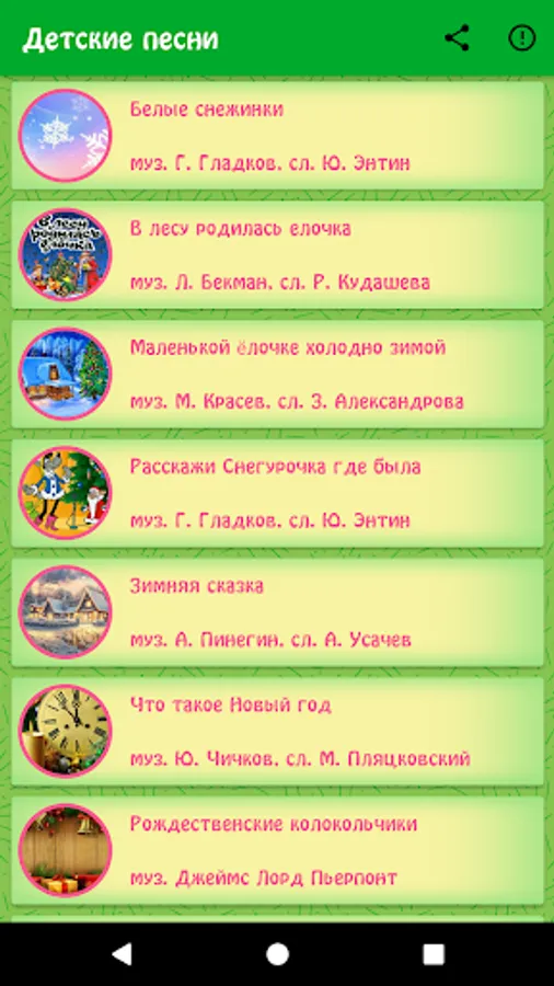 This appendix contains songs from the children's cartoon USSR. Songs of the Soviet cartoons teach a child the basics of morals, fosters respect and love for family, friends and animals.